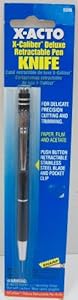 Product Description : A deluxe retractable blade knife. Features angled blade for precision cutting of heavyweight papers vellum films and acetate. Push button retractable blade and then stores easily and safely. Stainless steel blade. Perfect for scrapbooking. Warning: X-acto blades are extremely sharp. Use with caution. Wear safety goggles.